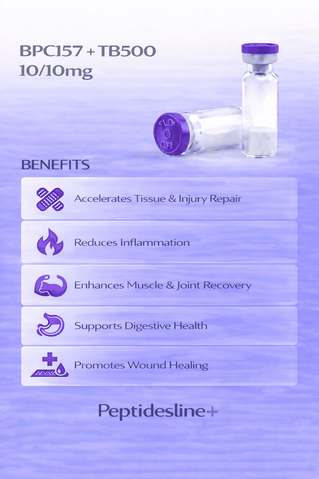 The formulation is listed as TB-500 (10mg) and BPC-157 (10mg). These amounts are provided for transparency and research reference when reviewing blend composition.