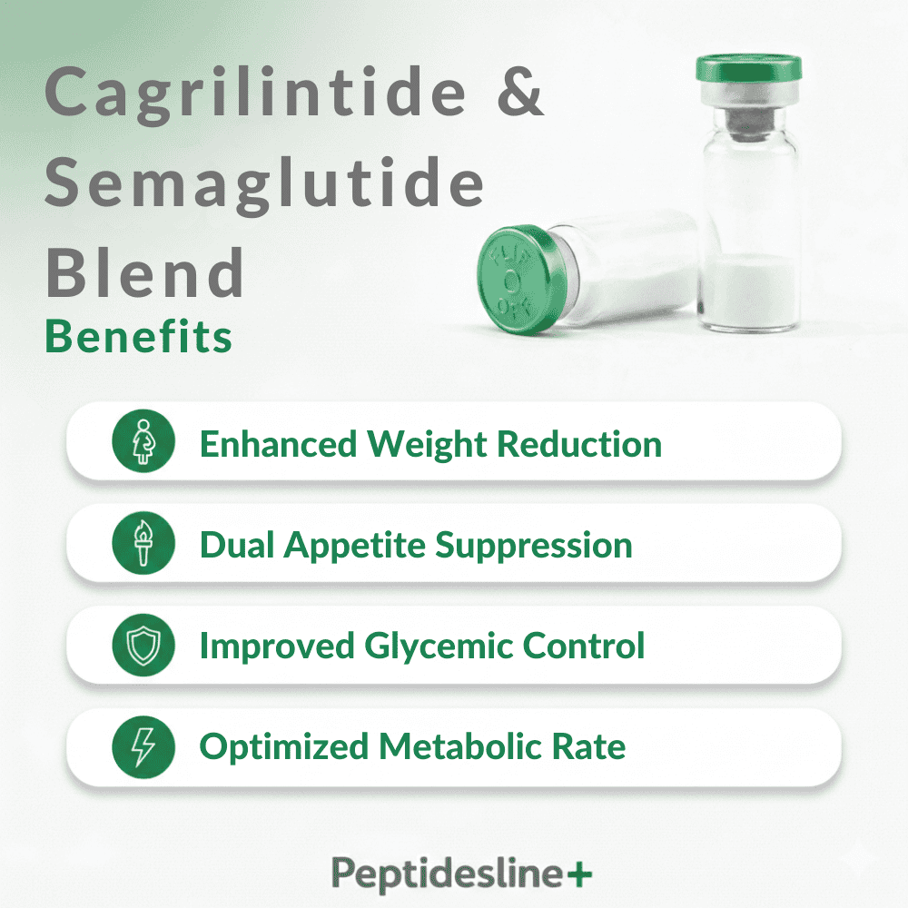 By stacking them, this blend attacks body fat via two independent pathways. While Semaglutide targets the GLP-1 receptors, Cagrilintide targets the amylin receptors. Research suggests this combination produces significantly greater weight loss results than Semaglutide alone.