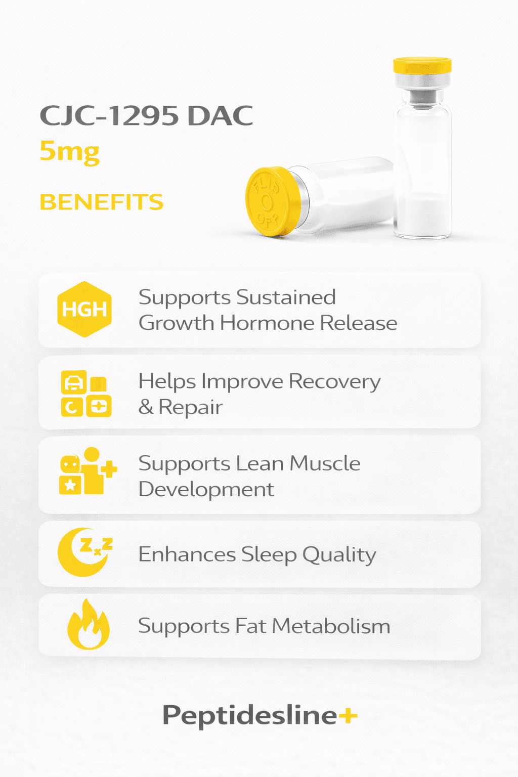 This product comes as a 5 mg lyophilized powder and must be reconstituted with bacteriostatic water. Due to its long half-life, CJC-1295 DAC is typically administered via subcutaneous injection once or twice per week. A common research dose is 1 mg to 2 mg per week. The 5 mg vial provides a multi-week supply for most research protocols. It can be taken at any time of day, as it provides a steady release rather than a quick pulse. Typical cycles last 3 to 6 months.