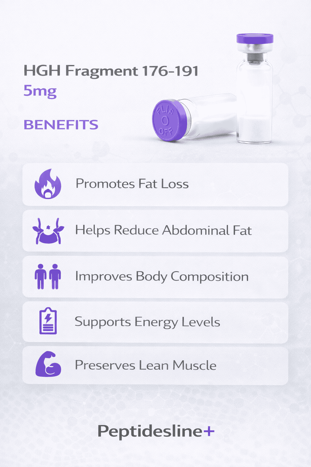 HGH Fragment 176-191 is a stabilized analogue of the growth hormone-releasing factor that specifically targets fat cells. This No Label 5 mg formulation represents the specific section of the human growth hormone (HGH) molecule responsible for fat metabolism. While full-length HGH has a wide range of effects, including muscle growth and bone development, Fragment 176-191 is isolated to focus solely on its fat-burning properties.